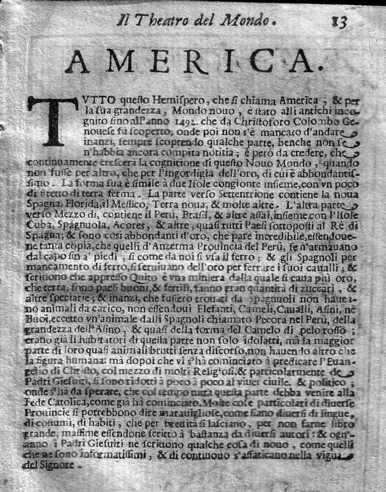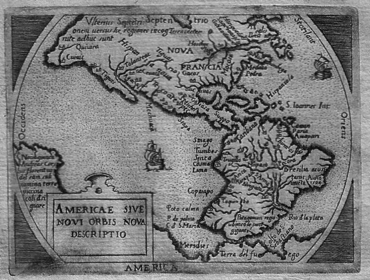 | Americae Sive Novi Orbis Nova Descriptio. An early map of the Americas where P. Querini adopts Ortelius' first depiction of South America with a bulging Chilean coastline, the whole continent veering westwards. The west coast of North America is also shown extending too far west. New Guinea is also shown to the west joined to an unidentified land mass named " Terra del Fuego". Two sailing ships in the ( not named ) Oceans. Querini, like Ortelius, in this atlas pays tribute to Christopher Columbus for the discovery of ' Mondo Nouo' in 1492. Price: $ 480.00 |