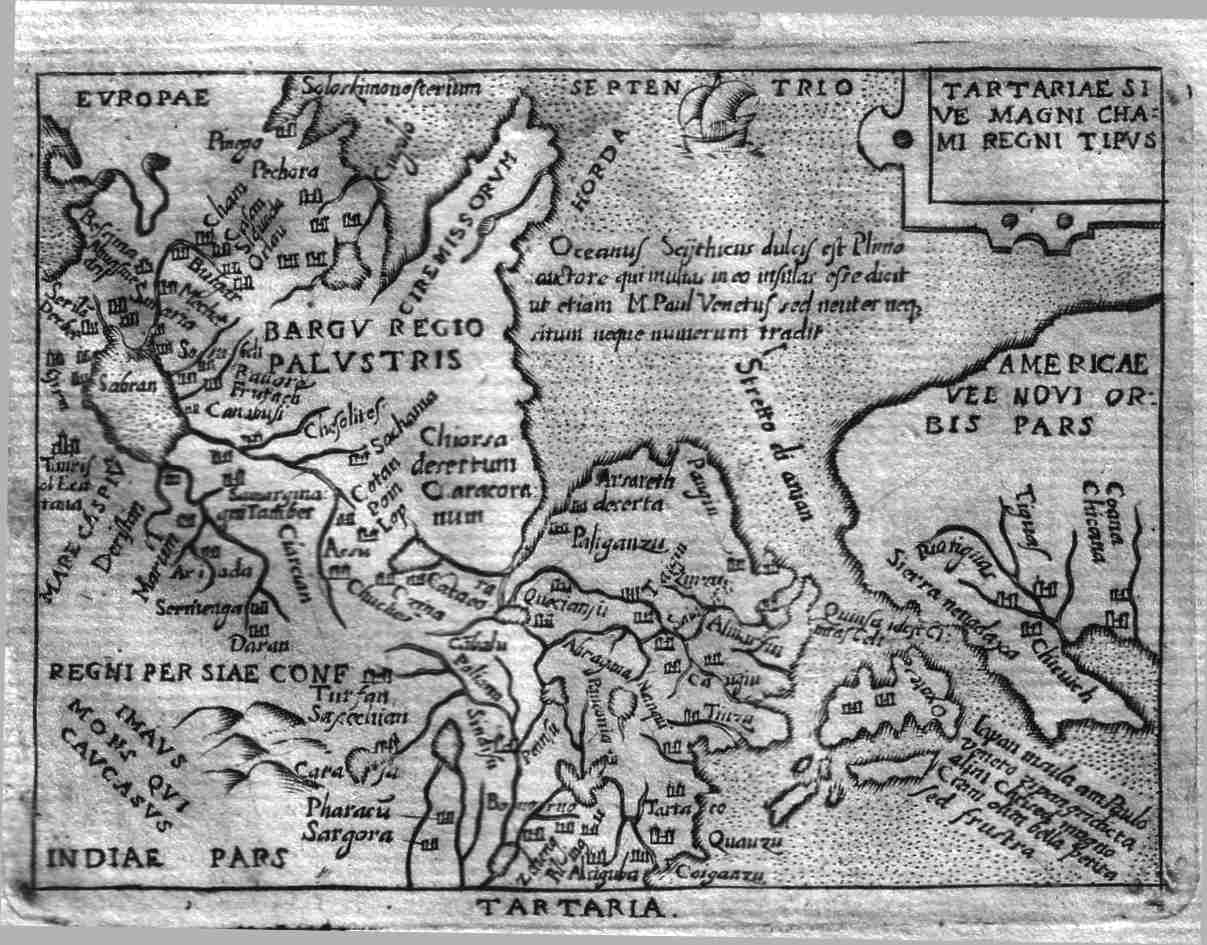 | Tartariae Sive Magni Chami Regni Tipus. A map extending from the Black Sea in the west to the Arctic and China Seas in the east. The Himalayas in the south extending to Mongolia, China and Japan. The coast of California a stone's throw away from Japan. A sailing ship in the Arctic Ocean. Price: $ 360.00 |