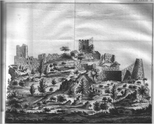 Westluk gezigt des kasteels Kantara, ook Ekaton of de Honderd en eene Kamers genaamd, op Cyprus. 19.5 x 16.5 cms. Pl. XXXIII a