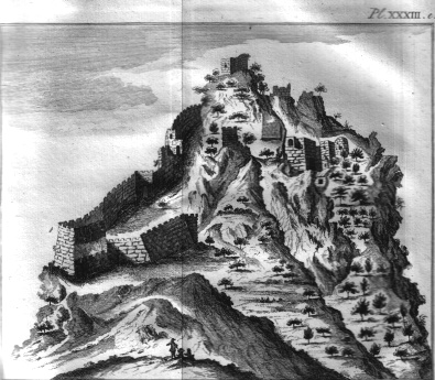 Luidoostlyk gezigt van het kasteel Agios Largos, of St. Hilarion, op Cyprus.19.5 x 16 cms. Pl. XXXIII e