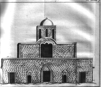 Gezigt van de voorzyde der Kerke van St. Mamas te Morpho, op Cyprus. Van