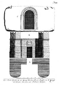 | De Platte-Grond, en Gezigt det Poort Nasfer, en gezigt der Deure van een oud Paleis te Kairo.13.5 x 20.5 cms. Pl. XIII. |
