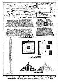 | Platte-Grond en Gezigt der Pyramiden van Bajamut. Gezigt der Obelisk van Bijidfje en der Zymuuren van den Tempel des Labyrinths. Afbeelding van het Meir Moeris. 15 x 21.5 cms. Pl. XXII |