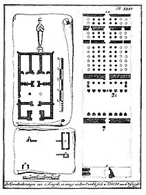 | De Grondteekeningen van 2 Tempels, en eenige andere Overblijfsels te Thebe, aan de Westzijde. 16 x 22. Pl. XXXV |