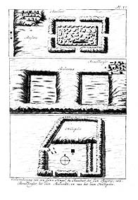 | Grondtekening van een ouden Tempel by Baalbait, het oude Bufiris; van Benalhasfar, het oude Bubastus; en van het oude Heliopolis. 14.5 x 21 cms. Pl. VI. |