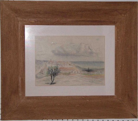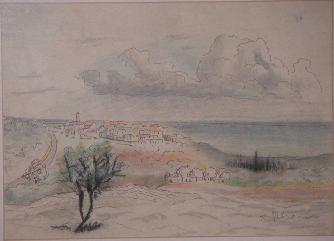 | Costas Averkiou. c1965. "Tylliria village by the Sea" (Pyrgos?). 36x26 cms. Mixed Media - Watercolour/ Ink/ Pastel. Framed. Price: CyP: 1950 |