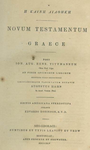 | 1845 NOVUM TESTAMENTUM GRAECE. by Tittmannum and Hahn. Wonderful antique volume in this New Testament in Greek, with a preface in Latin and some notes on the criticism in English. The body of the text is Greek. Measures 22 by 16 cms. 508 pages. Condition is as shown - Some wear/age. Hardcover. Hinges intact. Binding intact. Some age/wear outside, concentrated at edges and highpoints. Spine missing. Inside is good, generally clean, with light yellowing. Price: CyP 80.00 | |