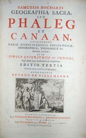 BOCHARTI, Samuelis - Geographia sacra, seu Phaleg et Canaan, cui accedunt variae dissertationes philologicae, geographicae, theologicae &c. (...) [3rd. ed. by Petrus de Villemandy]. Leiden, Cornelis Boutesteyn & Jordanus Luchtmans; Utrecht, Willem van de Water, 1692, folio, contemp. blindstamped vellum (sl. loosening at front, front joint splitting at top), spine title in ink, [8]-36-[12] pp.-1312 col.-[60] pp. (minor spotting, 4 maps loose- "Syria et Aegypti", map of "Baeticae partis", map of "Mauri Africae pars" and map of "Taprobanae insulae".).