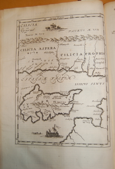 An impressive folio volume with magnificent bilingual maps ( Latin & Hebrew ) embellished with spectacular cartouches, sailing ships and sea monsters.