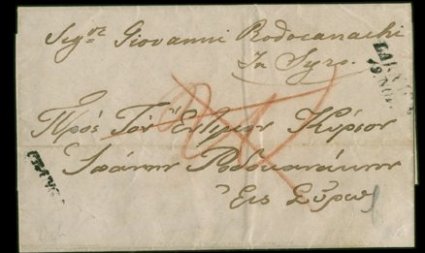 1856 FL to Syra, with the scarce "Larnaca 19 Nov" and "Franca" handstamps in black, both of the Austrian post office in Larnaca, with Syra arrival pmk. Fine and very rare early cover from Cyprus, seldom offered.