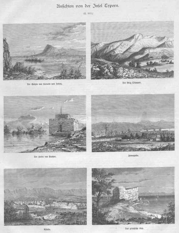 | Sketches of Cyprus, 1878. From a German magazine from with unrelated text on the back. Size of the whole image: 28 x 24 cm. The sketches show: Salt Lake of Larnaca, Mount Olympus, Port of Paphos, Famagusta, Nicosia, Greek Cape. Rare views not found in ILN. Price: CyP 60.00 |