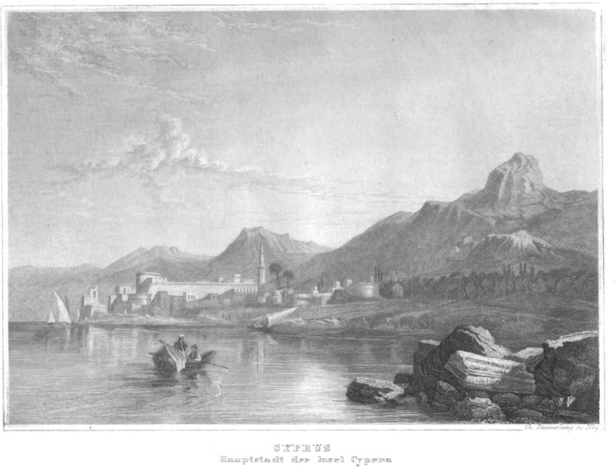 | Kyrenia, ca. 1850. This small steel engraving is printed on heavier paper, with no text on the back. Size of the image: 14,5 x 10 cms. Price: CyP 30.00 |