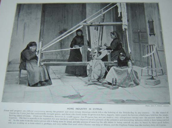| Home Industry in Cyprus. 1897. Entire page inc. margins measures 21x23 cms. Rare photogravure by Foscolo of Silk weavers and the traditional loom. Price: CyP 45.00 |