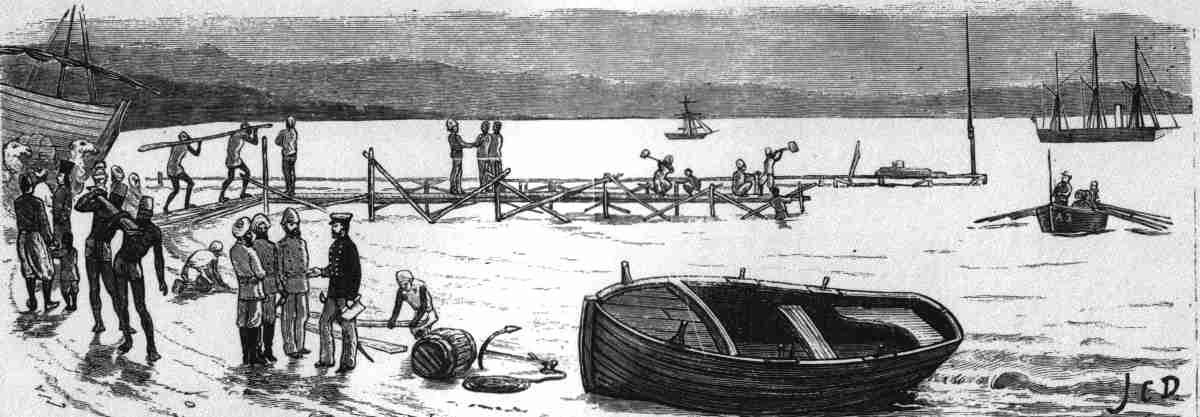 | 14. Building the pier at Larnaca. 1878. 22x8 cms. This engraving depicts the building of the wooden pier at Larnaca in Aug. 1878; a substantially smaller construction than the new iron pier built in 1881. Price: CyP 35.00 |