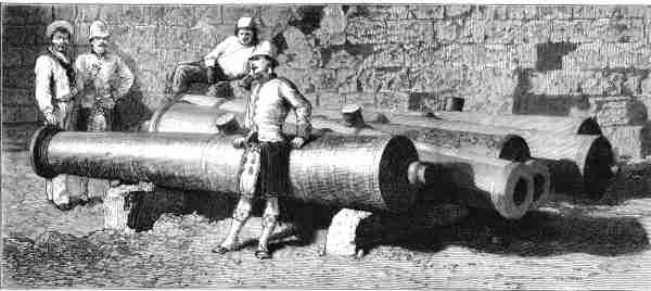 | 22. Ancient cannons at Famagusta. 1878. 23x10 cms. " Old bronze cannons, in considerable numbers, are lying here; and there are some mounted on the city walls, others dismounted and lying inside the gates, especially the water-gate. Most of these guns bear the winged lion, or the winged horse, on the chase of the piece" ILN, Oct. 5, 1878. Price: CyP 35.00 |