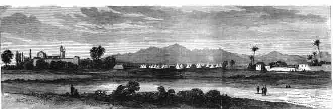 | 43. Monastery Camp, Headquarters of Sir Garnet Wolseley and staff, Nicosia. 1878. 31x10 cms. This sketch presents a view of the headquarters located at a camp a mile or so outside the Paphos Gate of Nicosia, near the Metokhi of Saint Prokopios, a dependency of the monastery of Kykko. The monastery building is shown on the left, the tents pitched for the Governor and his staff occupy the middle ground, and there are some farm buildings to the right and the Pentadaktylos range of mountains in the background. Price: CyP 40.00 |