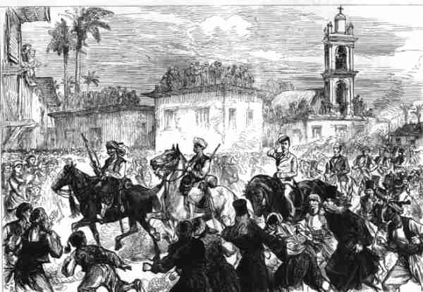 | 55. Triumphal entry of Captain Swaine into Lefconico. 1878. 31x21 cms. " ... the people were assembling at the entrance of the town of Lefkonico ( the most important town of the district) and soon as the kaimakam and his escort were observed coming over the plain, the bells of the Greek churches noisily clanged. Many hundreds soon gathered together in the streets and also on the roofs of all the houses..... and a good many priests" ILN , Oct. 1878. Price: CyP 40.00 |
