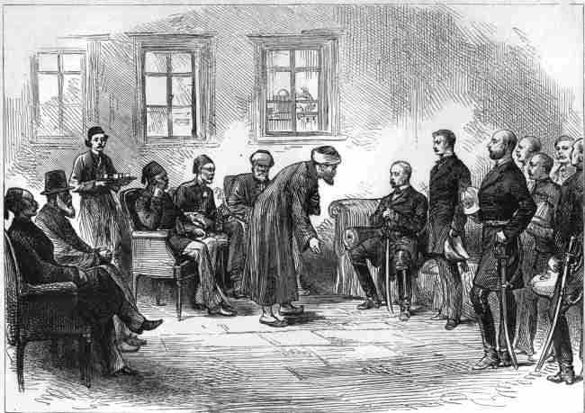 | 57. Sir Garnet Wolseley holding a reception in the konak, at the Turkish festival of Bairam. 1878. 21x15 cms. The illustration shows Sir Garnet and his suite receiving all the notables of Nicosia and the island, upon the occasion of the Moslem festival of Bairam, in August 1878. Price: CyP 20.00 |
