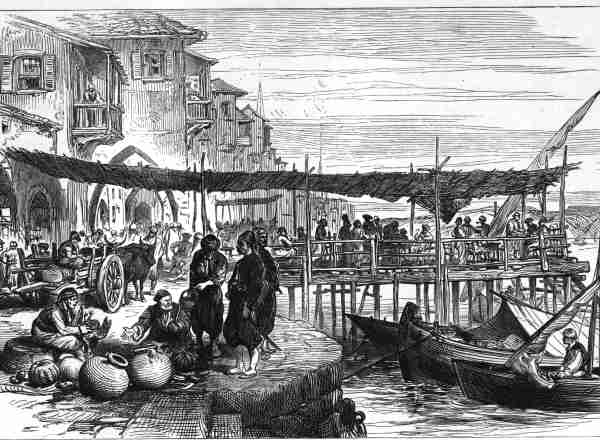 | 65. Waterside cafe at the marina, Larnaca. 1878. 21x15 cms. " The cafes are booths, as usual, on rickety wooden platforms projecting over the water, similar to those at Smyrna, one of which was disastrously precipitated some years since, with great loss of life....." ILN, August 17, 1978. Price: CyP 45.00 |