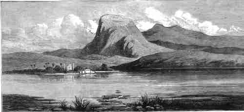 | 66. Mountain of the Holy Cross ( Stavrovouni), view from near Larnaca. 1878. 21x10 cms. This engraving illustrates Stavrovouni. The monastery of the Holy Cross on its summit has always been a frequent place for pilgrimages by the local Christians, as a piece of the HOLY CROSS is kept there, brought to the island by St. Helena, mother of Emperor Constantine, in the 4th. century. Significally the Moslem mosque amongst some pine trees that can be seen on one side of the salt lake is considered one of the most famous and sacred places of pilgrimage by the Moslems. It ranks third in the Moslem world, after Mecca and Medina. It is believed that Umm Haram, an aunt of the Prophet, was buried here. Price: CyP 45.00 |