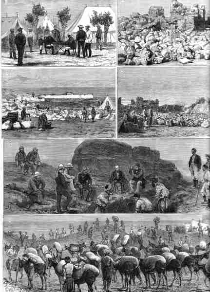 | 94. Sketches from Cyprus. 1880. 23x29 cms. A rare composite engraving illustrating 1. Engineers of the Eastern Telegraph Company laying the new line at Limassol; 2,3,4,5. The excavations at Larnaca ( Ancient Citium ) and 6. Labourers working in Mr. Janssen's depot of Terra Umber at Larnaca.( the image scanned is 3cms. 'short' towards the right) Price: CyP 45.00 |