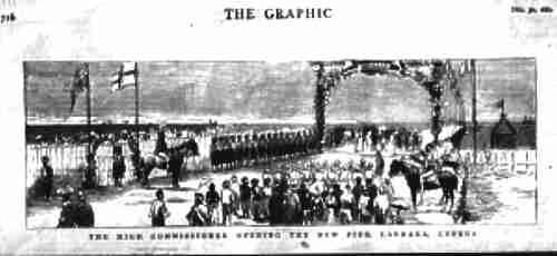 | 102. The High Commissioner opening the new pier. Larnaca. Cyprus. 1882. 23x7.5 cms. Rare date. The new iron pier was to replace the old wooden pier built hastily in 1878. Price: CyP 25.00 |