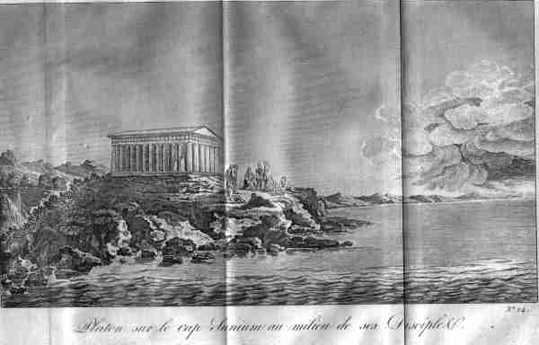 | 9. Platon sur le cap Sunium au de milieu de ses Disciple. 1784. 28x16 cms. Spectacular view of Cape Sunion and its Temple. Early woodcut engraving with two original folds ( that can be easily ironed out when framed ) from Jeune Anacharsis' travels to Greece. Price: $ 90.00 |