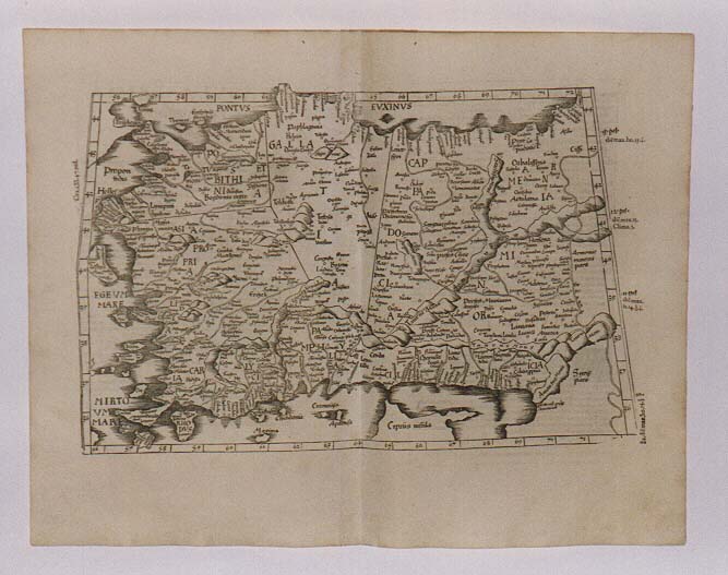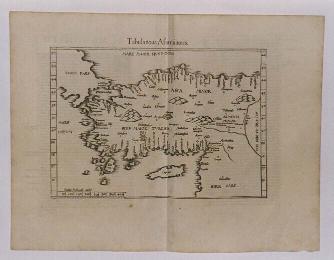 | Tabula Nova Asiae Minores + Tabula Prima Asia by Waldseemόller/Fries. 1541, Strassburg. From the Ptolemy Argent Atlas. Size 40x29 cms. EACH. Two Waldseemόller/Fries maps of Anatolia: the Ptolemy map with the view from antiquity and the new Renaissance map changing shape. These woodcut maps are Fries' reductions of Waldseemόller's 1513 maps of the area. The 'tabula nova' is (after the 1513 version) the earliest obtainable modern map of present-day Turkey and Cyprus. The Ptolemy map of Cyprus is with the Carpas Peninsula pointing westwards . From the 1541 Servetus edition. Some wormholes were expertly repaired and do not detract. Latin text on verso. The maps are offered for sale as a pair. Price: $ On request |
