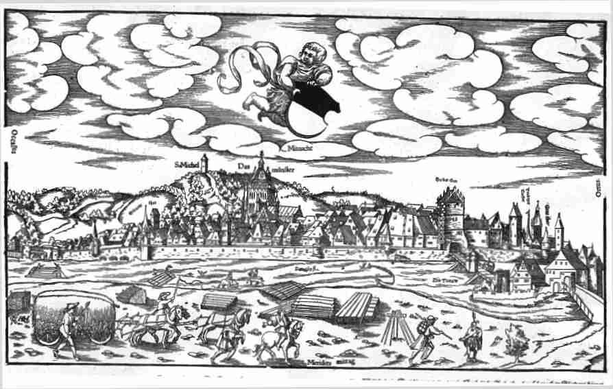 | Wahrhasste Contrafehtung der Reichs statt Ulm / wie sie zu unser zeit im wesen ist. 37x22 cms. Double page view of the German city of Ulm on the river Danube. Title above top margin; text below view. Elaborate cartouche of youth holding a shield in the clouded sky. Rafts in the river and peasants going about their rural chores on the banks of river. Ref: MGCV13 Price: $ 275.00 |