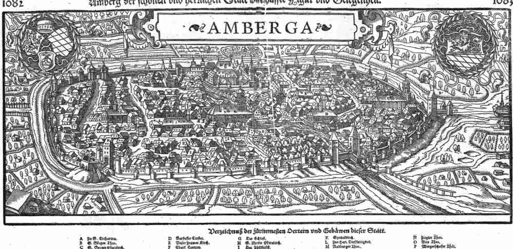 | Amberga. / Amberg der schönen und herzlichen Statt warhaffte Figur un Gelegenheit. 36.5x15.8 cms. Double page view of the German town of Amberg. Title above top margin and in banner within view; text beneath image. 15- name, five-column index below image. Decorative cartouche and title blending into image. Small woodcut of an eagle attacking a swan below view. Soiling confined to margins only. Ref # MGCV15 Price: $ 175.00 |