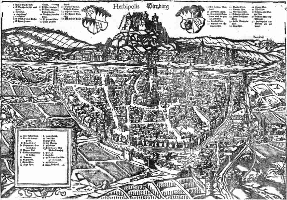 | Herbipolis Wirtzburg. Beschreibung der Statt Wirtzburg mit sampt dem Furstlichen Schlosz.. 39.4x27.5 cms. Double page view of the German town of Wurzburg in Bavaria, on the river Main. Title above top margin; 54 name, eight column index inside view at top left and right sides. Two coats of arms. Ref # MGCV17 Price: $ 325.00 |