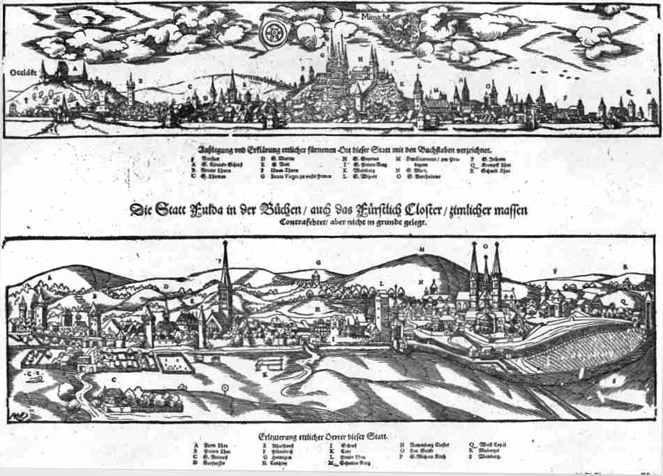 | Erdfurt die Hauptstatt in Thüringen nach eusserlichem ansehen auff sallerfleissigst Contrafehtet. 36x7.5 cms. Double page view of the German town of Erfurt in Thuringen on the river Gera with Die Statt Fulda in der Buchen / auch das Fürstlich Closter / zimlicher massen contrafehtet / aber nicht in grund gelegt, a 36.3x10.5 cms. double page view of the town of Fulda in Hessen, on the river Fulda, below. Both views with indices below views. Text on verso faintly showing through on to recto. Ref # MGCV20 Price: $ 215.00 |
