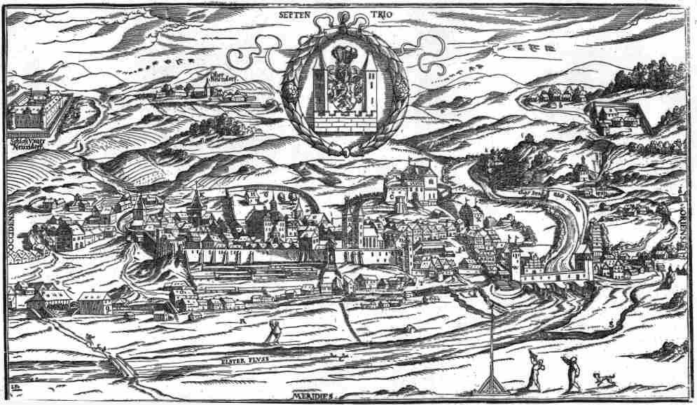 | Plawen der Haupstatt Narisciae wahre Abcontrafactur. 39.4x22.6 cms. Double page view of the German town of Plauen on the river Elster. Very faint show through of verso on to recto. Title above top margin; 34-name, five-column index below image. City's crest in the middle of view; flocks of birds in the sky; river Elster in the foreground. An archer aiming at a bird on top of a pole, with a crossbow, below right! Ref # MGCV21 Price: $ 250.00 |
