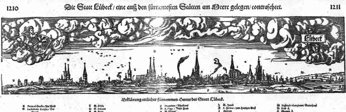 | Die Statt Lübect / eine ausz den fürnemesten Statten am Meere gelegen / contrafehtet. 38.5x8.5 cms. Double page view set in two pages of text of the German town of Lubeck in Schleswig - Holstein ( on Trave & Wakenitz rivers ). Title above top margin; five column index below image with extensive text. Pages evenly browned. Small hole and split outside view area expertly repaired. Angels holding title and city's coat of arms in skyline. Ref # MGCV25. Price: $ 110.00 |