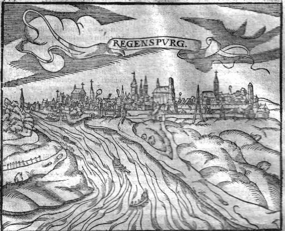 | Contrafehtung der Statt Regenspurg. 15 x12 cms. View set in a page of text of the German town of Regensburg in Bayern, located on the Danube where it joins the river Regen. Ref # MGCV28 Price: $ 80.00 |
