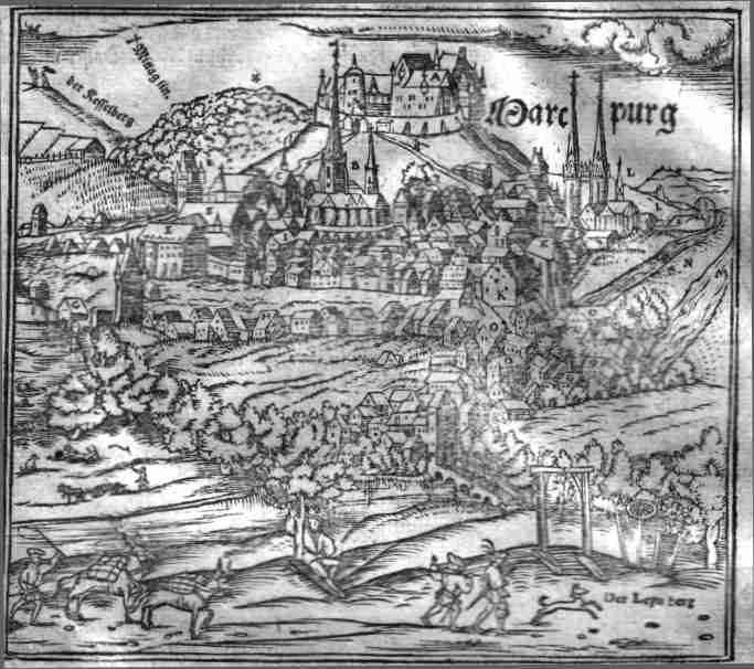 | Der berumpten Statt Marpurg Abcontrafactur. 14.8x13 cms. View set in a page of text of the German town of Marburg, in Hessen, located on the Lahn river. Fourteen name index below view. Ref # MGCV32 Price: $ 80.00 |