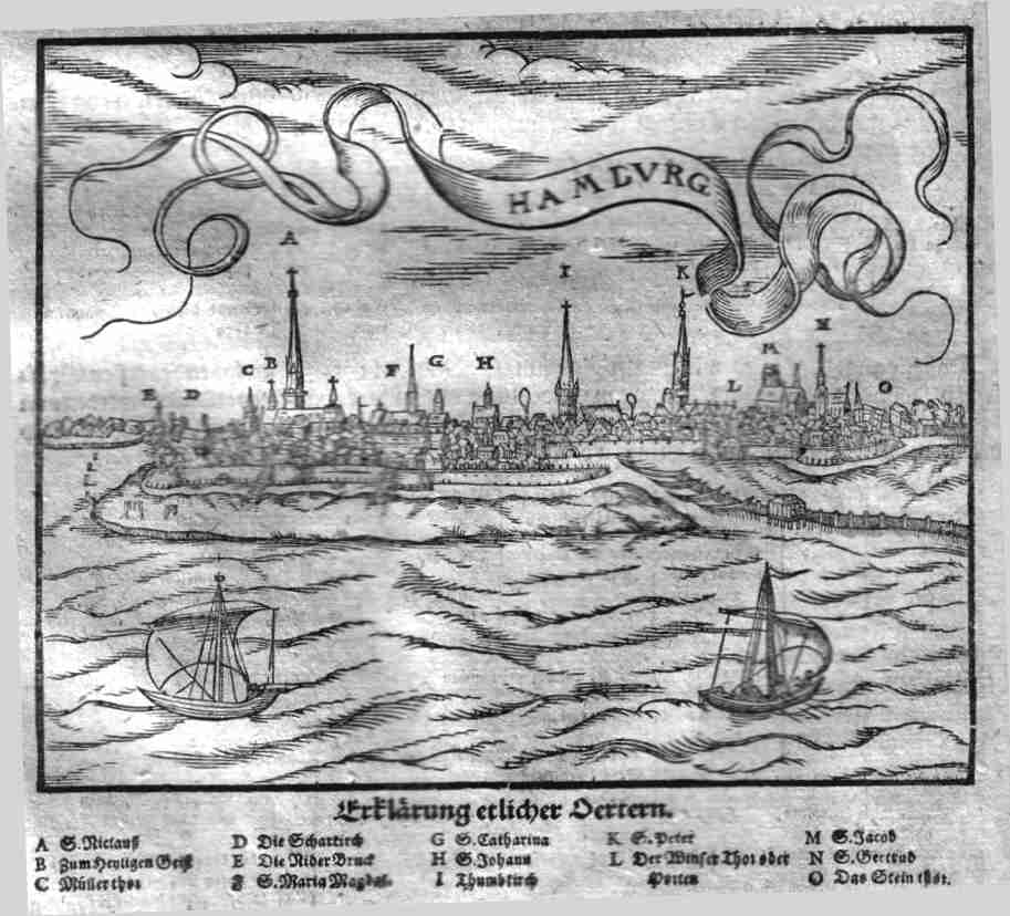 | Hamburg. 15.5x12.5 cms. View set in text of the German port city of Hamburg, located on the river Elbe and connected to the North Sea. Fourteen name index below view. Ref # MGCV37 Price: $ 90.00. |