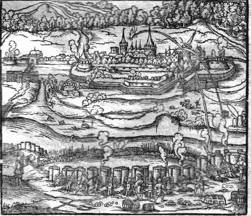 | Wolffenbuttel/ sampt derselben Belaegerung Abcontrafactur. 14.4x12.4 cms. View set in a page of text of the town of Wolfenbuettel in Lower Saxony. The town is under siege with canon fire destroying its churches' towers. Notice the soldier on the left directing canon fire. Ref # MGCV42 Price: $ 90.00 |