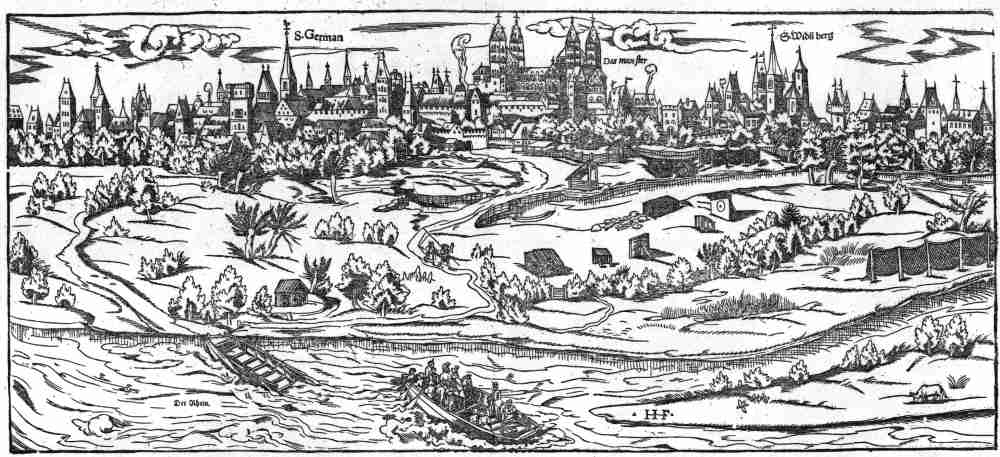 | Die Reichstatt Speier / so voz zeiten Ciuitas Memetum: das ist/ Memeter Statt/ hat geheissen. 37.8x16.8cms. Double page view of the German town of Speyer on the Rhine. Title above top margin; text below view. Passenger boat crossing the river in the foreground. Headpiece on verso faintly shows trough on to recto. Ref # MGCV6 Price: $ 215.00 |