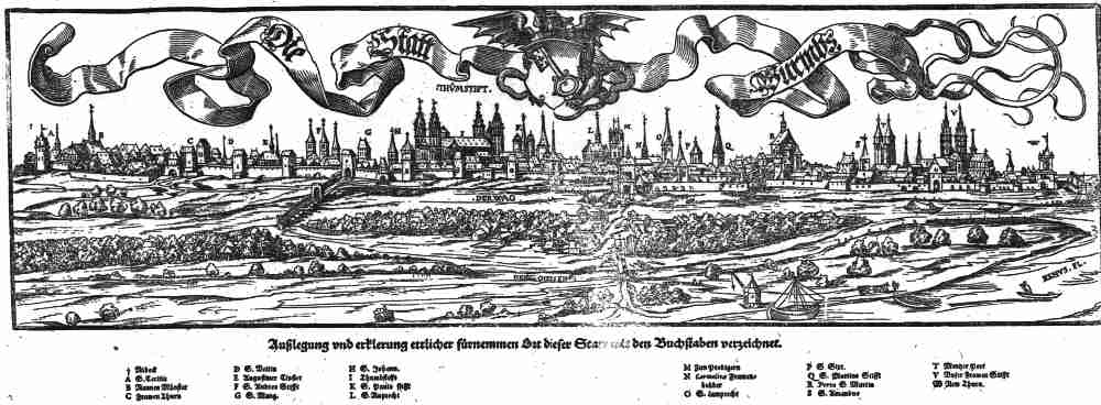 | Wahre Contrafactur der loblichen / alten und des heylingen Reichs Freistatt Wormbs am Rhein gelegen/ hey den Aitzen Vrbs Vangionum genannt. 40.2x12 cms. Double page view of the German town of Worms on the Rhine. Title above top margin and in strapworks within view; text beneath image. 24-name, six-column index below image. Town's coat of arms in the middle; small boats in the river in the foreground. Ref # MGCV7 Price: $ 175.00 |