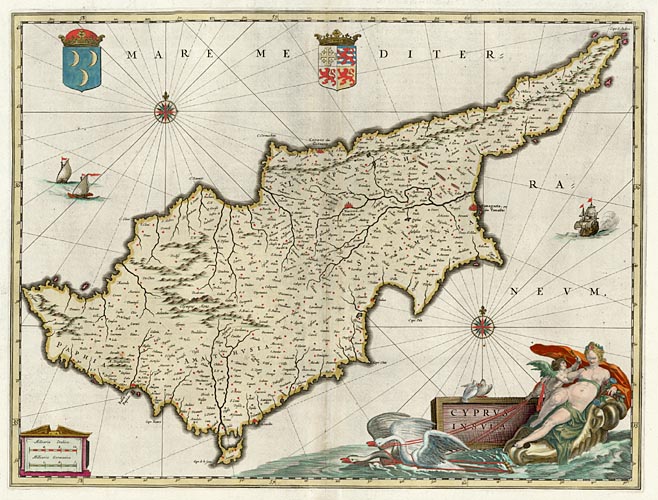 | Cyprus Insula. Willem Janzsoon Blaeu. Amsterdam 1640. 50x35 cms. French text on verso. A nice example of this gorgeous map in full original colour and wide margins. Beautiful decorative cartouche with Aphrodite being drawn to Paphos by two swans, two coats of arms, two compass roses and three sailing ships. Price: CyP. 1000.00 Framed |