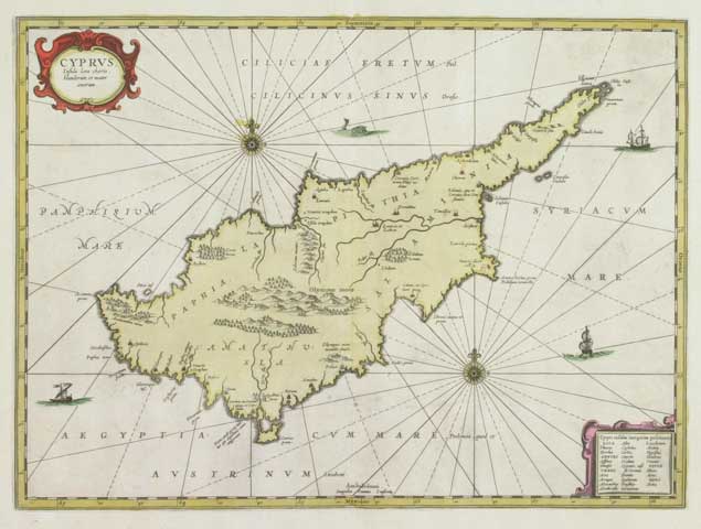 | Cyprus Insula laeta choris, blandorum et mater amorum by Johannes Jansson. Amsterdam 1651. Size 47 x34 cms. Original handcoloured copper plate map of Cyprus in very good condition. Price: CyP 850.00 Framed |