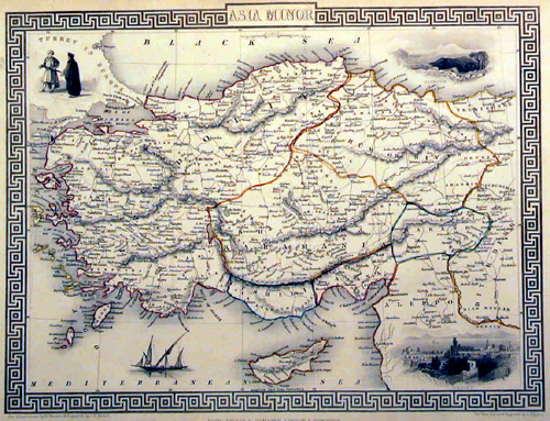 | Asia Minor by John Tallis. London 1851, 33x25 cms. Original outline colour, overall good to fine condition. A map of Turkey, showing Cyprus, with engraved vignettes including a prospect of Rhodes and Mount Olympus Price: CyP 65.00 |