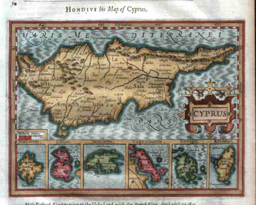 | CYPRUS by Purchas/Hondius. 1625. 19x14 cms. In text edition and English text on verso. Old but not original colour. Nice decorative cartouche and inset isles of Stalimni, Chius, Mitilene, Cerigo and Rhodus. Price: CyP 625.00 Framed |