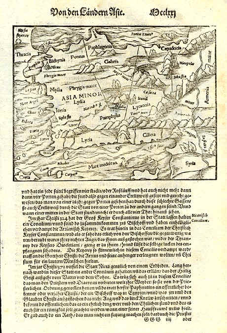| Von den Landern Asie [Asia Minor]. Sebastian Munster. 1579. Basle. 19x15 cms. Detailed map of Asia Minor, extending east to the Euphrates, South to the Mediterranean, North to the Black Sea and including Thracia. Munster's Cosmography was one of the most influential georgraphical works of the 16th Century. It was published in a number of editions over a half century and was continuously revised and updated to include new illustrations and updated information. Price: CyP. 85.00 |