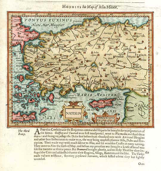 | Natolia. Samuel Purchas & Jodocus Hondius. London / 1625. Hand Coloured. 19x15 cms. Detailed map of the region bounded by Black Sea and Constantinople, the Aegean Sea, Crete, the Mediterranean and Asia Minor. From the 1625-26 edition of Purchas His Pilgrims, one of the seminal early 17th Century English Language travel works. On a 32x22 cms. sheet with English text, front and back. Price: CyP 120.00 |