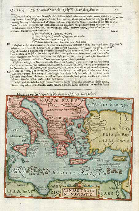 | Aeneae Troiani Navigatio. Samuel Purchas & Jodocus Hondius. London / 1625. Hand Coloured. 20x15 cms. Interesting regional map, illustrating the ships of Troy in the Mediterranean. From the 1625-26 edition of Purchas His Pilgrims, one of the seminal early 17th Century English Language travel works. On a 32x22 cms. sheet with English text, front and back. Price: CyP 135.00 |