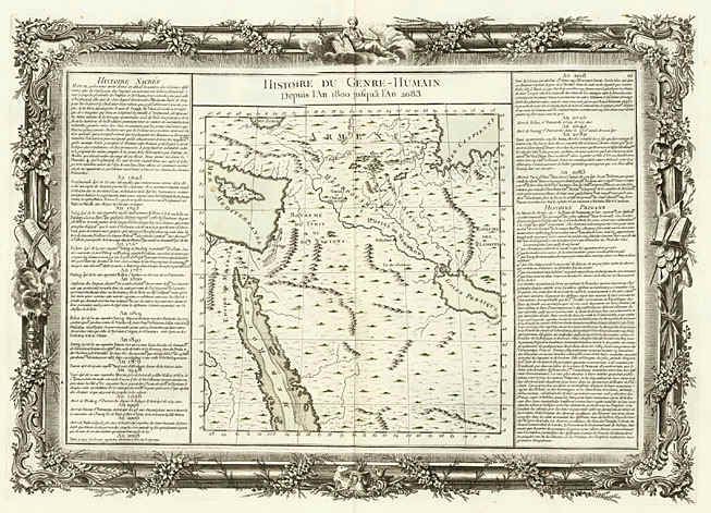| Histoire Du Genre-Humain Deupus L'An 1800 jusqua l'An 2083. by Buy de Mornas. Paris / 1756. 61x35 cms. Decorative and interesting map of the region bounded by the Mediterranean and Cyprus, Armenia, the Caspian, Persian Gulf, etc. Includes remarkable decorative borders found only in the deluxe edition of Buy De Mornas' Atlas Methodique et Elementaire de Goegraphie et l'Histoire. Price: CyP 115.00 |