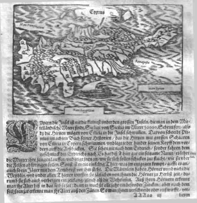 | Von der Insel unnt Ronigreich Cypern. Munster, Sebastian. Basel 1614. Sebastian Henricpetri. 15x9.5 cms. In text map of Cyprus with Nicosia, Famagusta and Kyrenia marked. Sailing ship at Mare Aegyptum. Verso in text woodcut of stag, 13.5x9.5 cms. Ref. # MCYP01. Price: CyP 265.00 |
