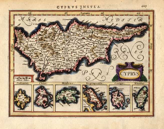 Hondius' folio map of Cyprus with insets of the Mediterranean islands;